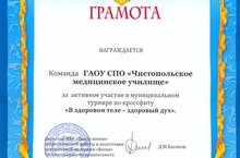 Грамотой награждается Команда ГАОУ СПО "Чистопольское медицинское училище" за активное участие в муниципальном турнире по кроссфиту "В здоровом теле - здоровый дух".