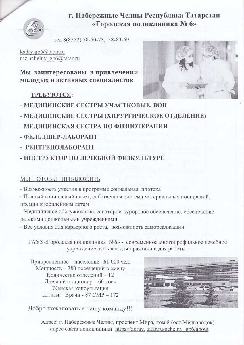 02.04.2022г. "Городская поликлиника №6" г. Набережные Челны: письмо с просьбой о содействии в кадровом обеспечении, доступные вакансии