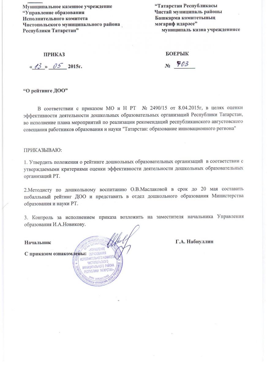 Приказ МКУ "Управление образования Исполнительного комитета Чистопольского муниципального района РТ" "О рейтинге ДОО"