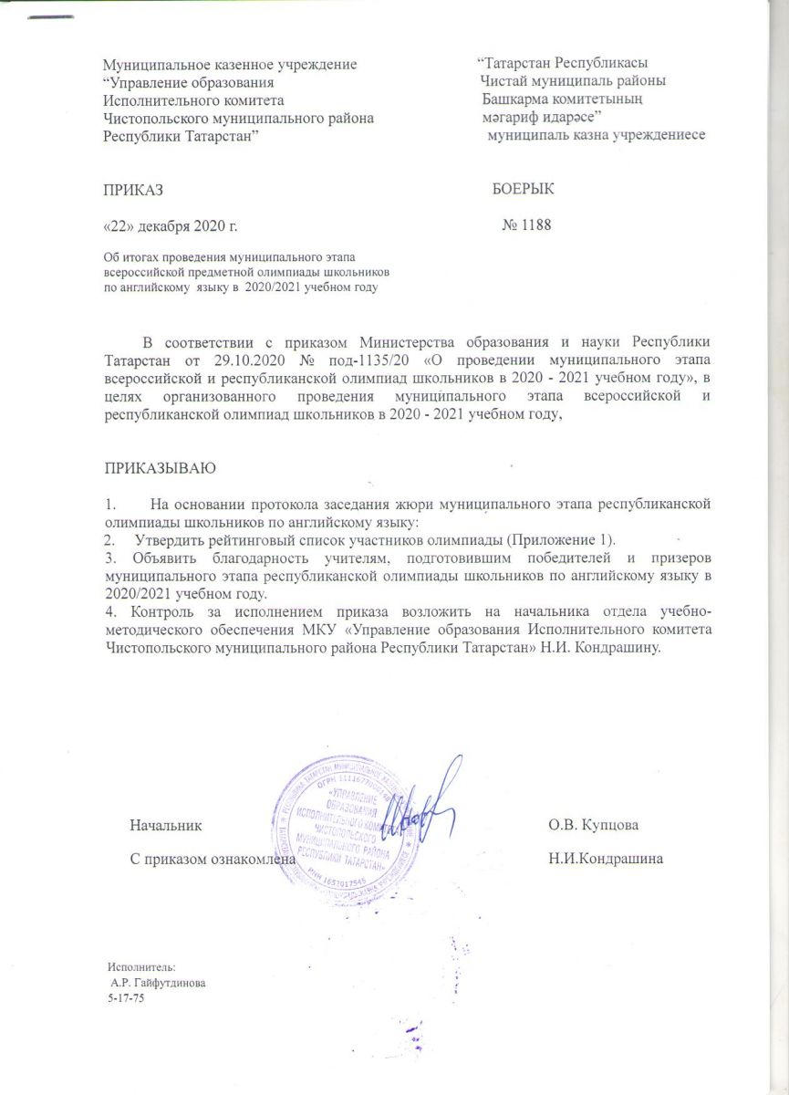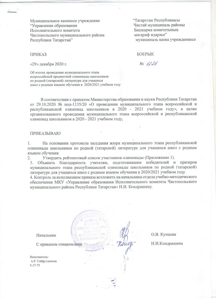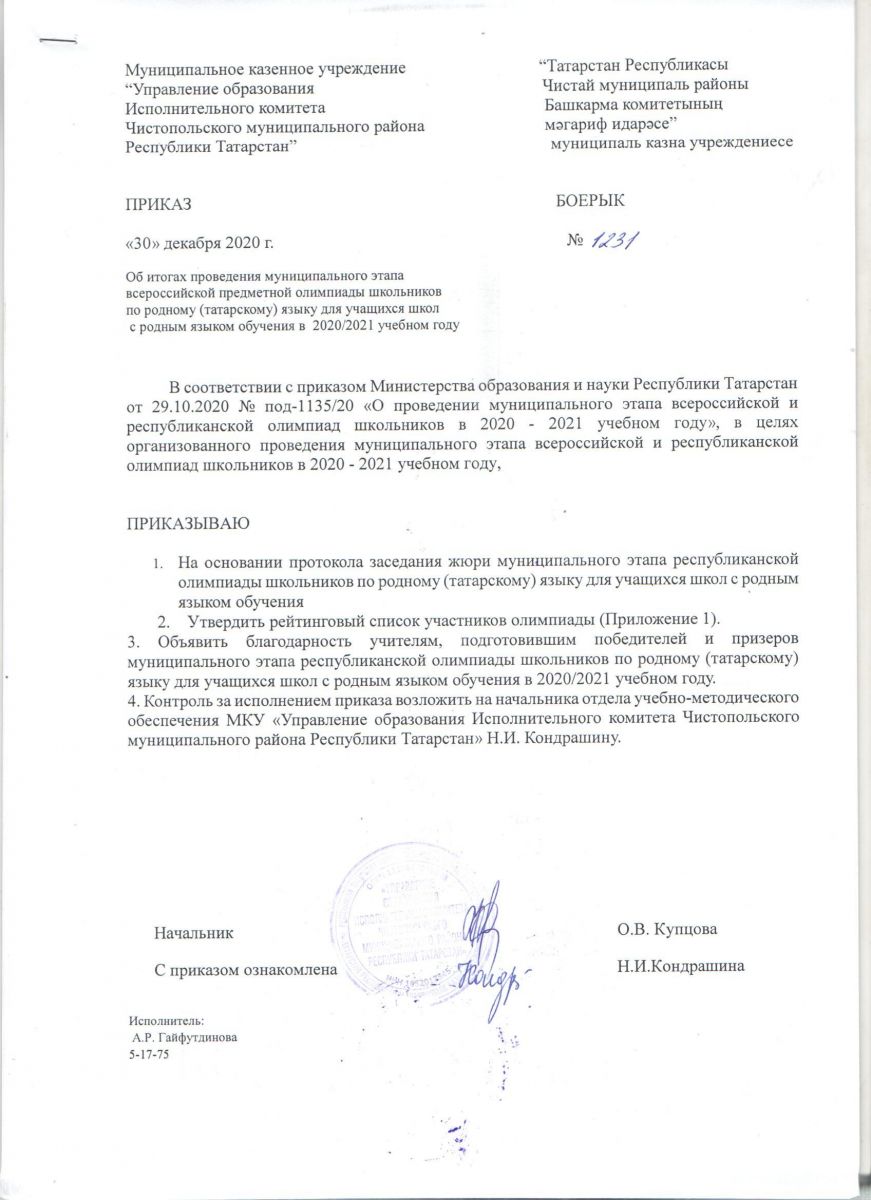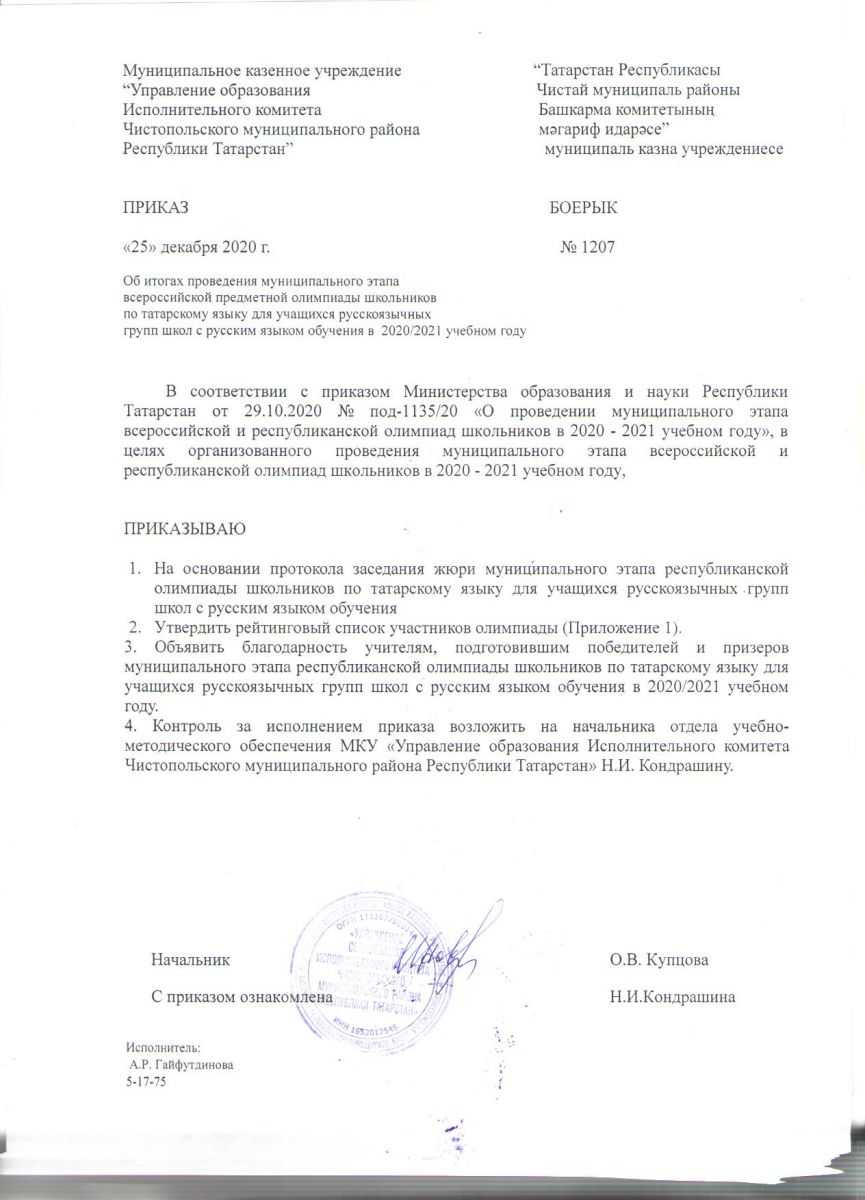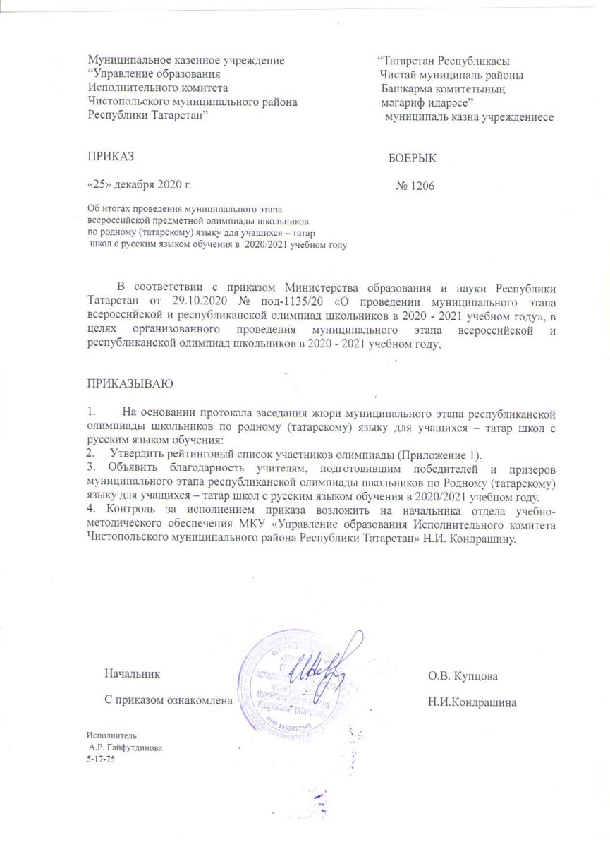 Приказ МКУ "Управление образования Исполнительного комитета ЧМР" РТ " О проведении школьного этапа Всероссийской и Республиканской олимпиад школьников в Чистопольском муниципальном районе в 2020-2021 уч.году"