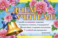 Уважаемые педагоги, поздравляем вас со Всемирным днём учителя! От всего сердца желаем вам здоровья, успехов, оптимизма и новых творческих свершений в вашем благородном труде. Мы искренне благодарим вас за доброту, душевное участие и самоотверженность, благодаря которым определяются высокие результаты образовательной деятельности. Пусть из года в год судьба дарит вам встречу с признательными, стремящимися к знаниям учениками. Пусть новостная лента сообщает о выдающихся достижениях ваших выпускников, порождая чувство гордости и выставляя отличную оценку вашим профессиональным навыкам.
