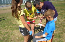 Сегодня в прошкольном оздоровительном лагере День здоровья и спорта. На Минутке здоровья дети учились обрабатывать раны.Среди отрядов состоялся турнир по футболу, посвященный Дню отца. В нём принимали участие как дети так и взрослые.