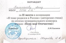 Сегодня в МБУ "Центр военно-партиотической работы и подготовки допризывной молодежи "Ватан" Чистопольского муниципального района" проходил муниципальный конкурс чтецов "Пою мое Отечество". В этом конкурсе принимали участие и наши школьники: ученица 6А класса заняла II место в номинации "Я тоже родился в Росии"(авторские стихи), руководитель Жирнова Л.А.; ученица 10 класса заняла III место в номинации "И сладко песнь в честь Родины поется", руководитель Галеева М.В.; учащийся 9А класса награжден грамотой за активную жизненную позицию, руководитель Казанцева А.Г.