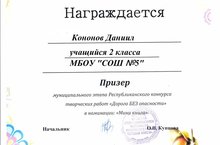 Бүген 2 нче "Г" сыйныфы укучысы Кононов Данилга "Юл куркынычсызлыгы" республика бәйгесенең муниципаль этабында призлы урын яулаган өчен грамота тапшырылды.