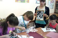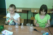 В первой половине дня воспитанники лагеря занимались художественным трудом. Работа оказалась увлекательная. Девочки заняты поделками из пластиковых бутылок. С интересом вырезают бабочек и цветы для оформления пришкольного участка.