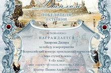 Ученица 8 А класса Закирова Диляра принимала участие во Всероссийском конкурсе прикладного творчества «Зима стучит в окно».