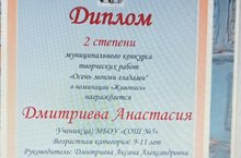 Учащиеся 3 б класса (кл руководитель Дмитриева А. А.) приняли участие в муниципальном конкурсе творческих работ "Осень моими глазами" . Дмитриева Анастасия и Сабитова Азалия заняли 2 место.
