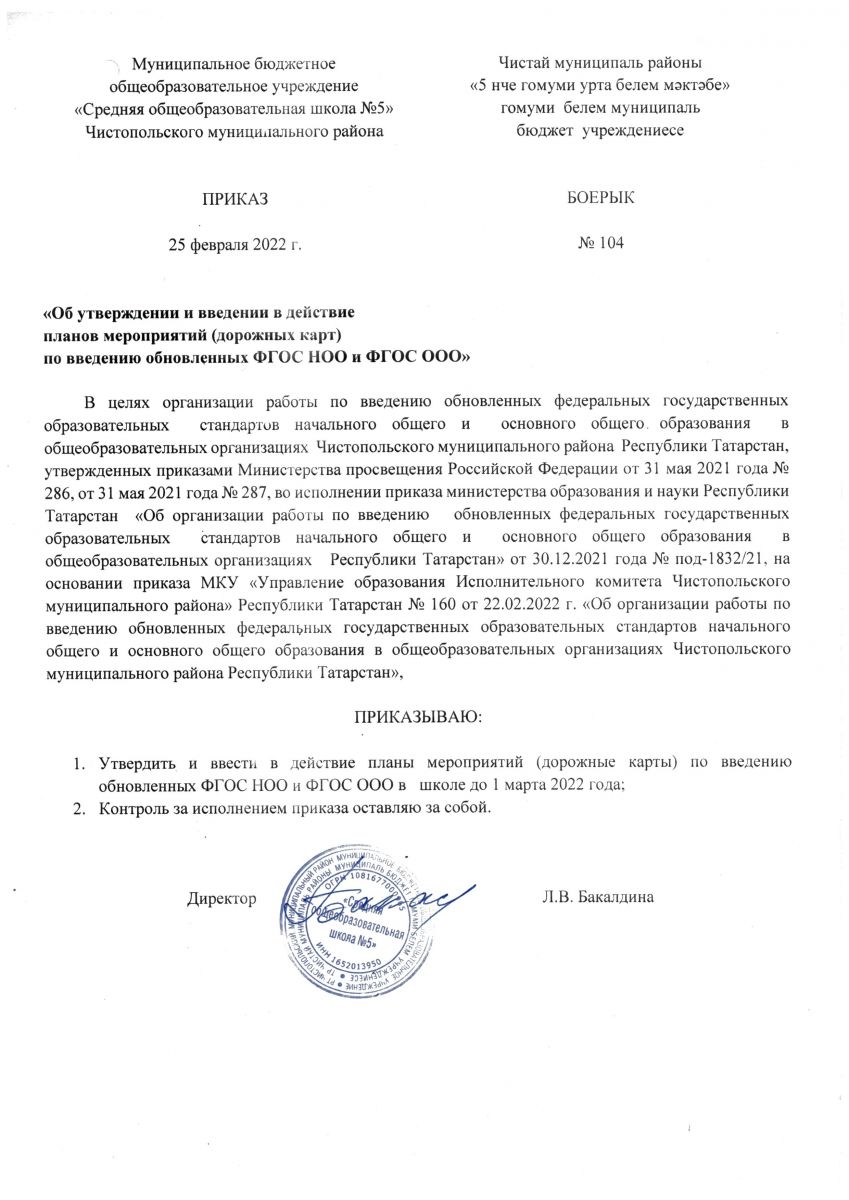 Приказ МБОУ "СОШ №5" "О разработке основной образовательной программы основного общего образования"