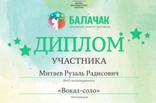 Наш воспитанник участвовал в республиканском вокальном конкурсе-фестивале юных талантов «БАЛАЧАК», благодарим за участие, желаем творческих успехов. / Безнең тәрбияләнүчебез «БАЛАЧАК» Яшь талантлар республика вокаль конкурс-фестивалендә катнашты, катнашканы өчен рәхмәт белдерәбез, иҗади уңышлар телибез.