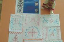 Закрепляя знания об орнаменте воспитанники срашей группы украсили фартук с традиционными татарскими растительными узорами. \ Орнамент турында белемнәрен ныгытып, өлкән төркем балалары альяпкычны традицион татар үсемлек бизәкләре төшереп ясадылар