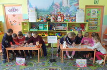 Бакчабызда татар мәдәнияты белән танышу буенча эш алып барыла. Бүген балалар татар халык орнаментлары белән танышуны дәвам итеп, кәгазьдән ясалган кечкенә чиләкләргә гөлҗимеш һәм кыңгырау орнаментын кисеп ябыштырдылар.