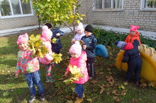 Балалар бакчада яфраклар белән танушуын дәвам иттеләр. Яфракларныӊ ничек тирбәләп җиргә тешүләрен тикшерделәр, рәсемгә төшерергә дип төрле яфраклар жыйдылар.
