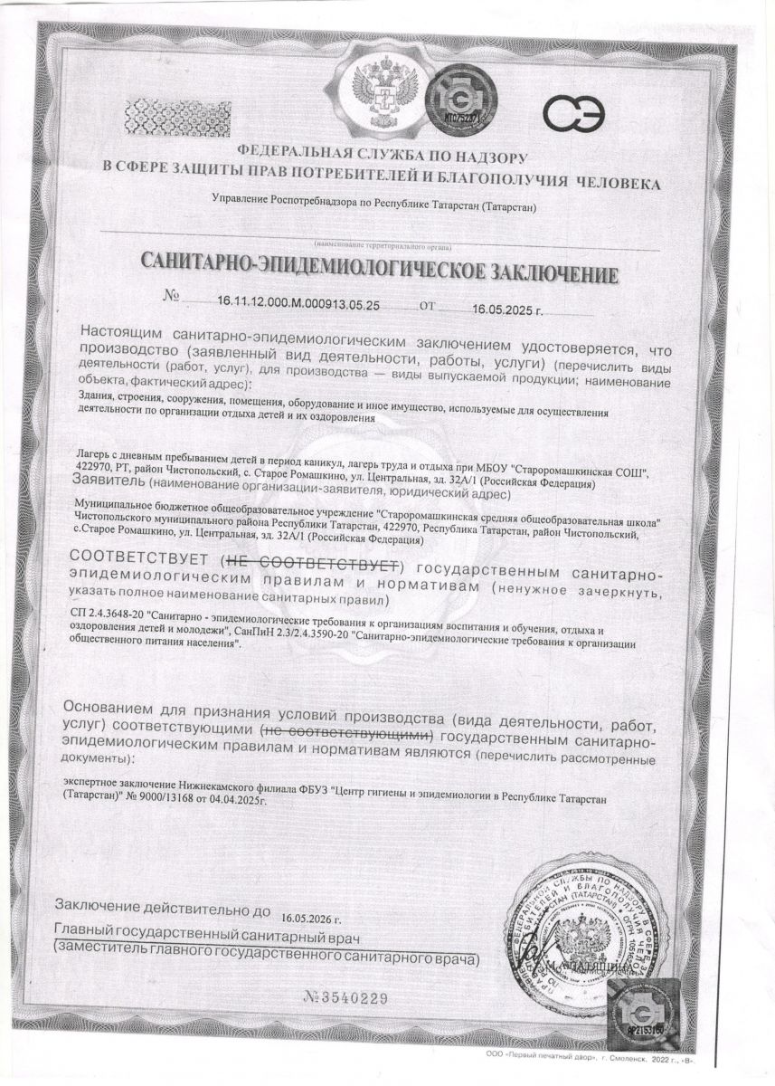 | Адрес: | 422970, Республика Татарстан, Чистопольский район, с. Старое Ромашкино, ул. Центральная, д. 32А/1 |