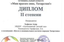ТАССР ның 100 еллыгы уңаеннан оештырылган муниципаль "Мин яратам сине, Татарстан!" дип аталган конкурста катнаштык һәм Диплом белән бүләкләндек.