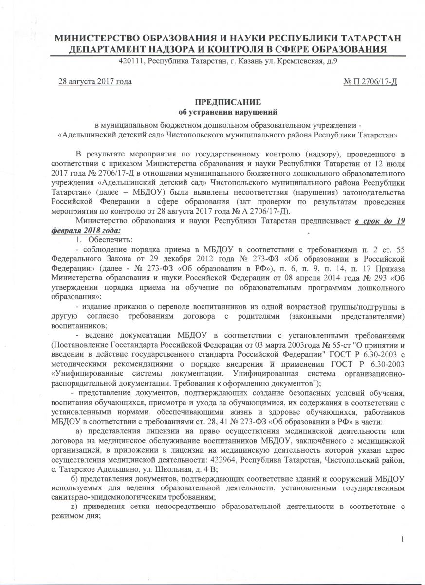Предписания органов, осуществляющих государственный контроль (надзор) в сфере образования, отчеты об исполнении