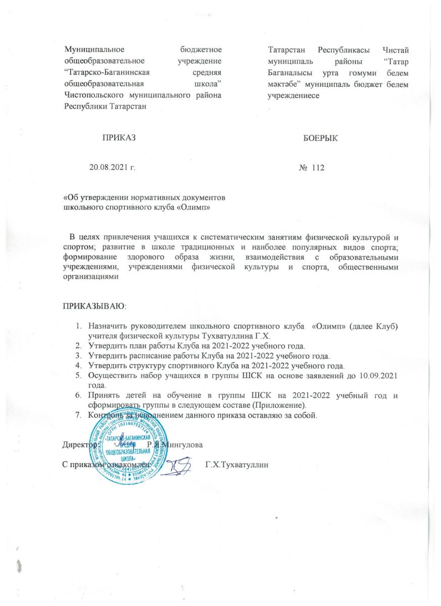 Приказ "Об утверждении нормативных документов школьного спортивного клуба "Олимп" 2021-2023