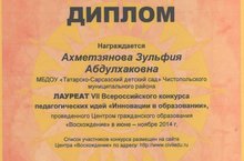 Наша заведующая Ахметзянова Зульфия Абдулхаковна награждена дипломом лауреата VII Всероссийского конкурса педагогических идей "Инновации в образовании" проведенного Центром гражданского образования "Восхождение".