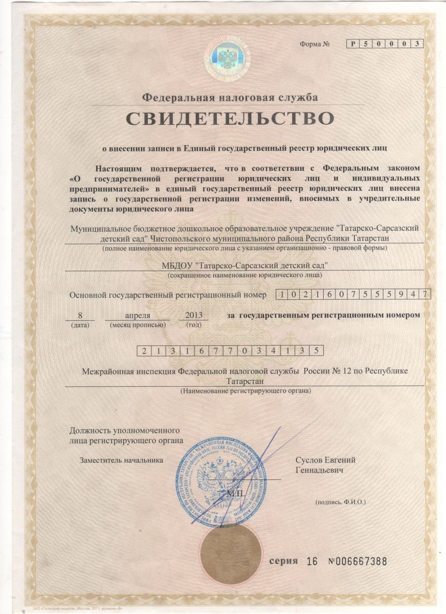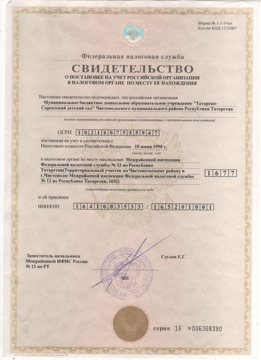 Свидетельство о постановке на учет юридического лица в налоговом органе