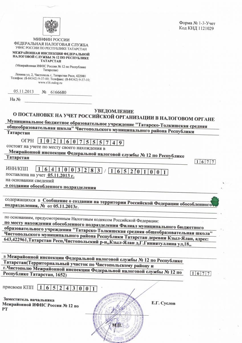 Уведомление о постановке на учет Российской организации в налоговом органе
