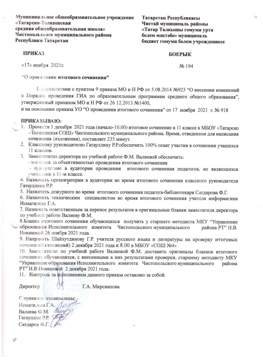Приказ "о проведении итогового сочинения ( изложения) в 2021-2022 учебного года"