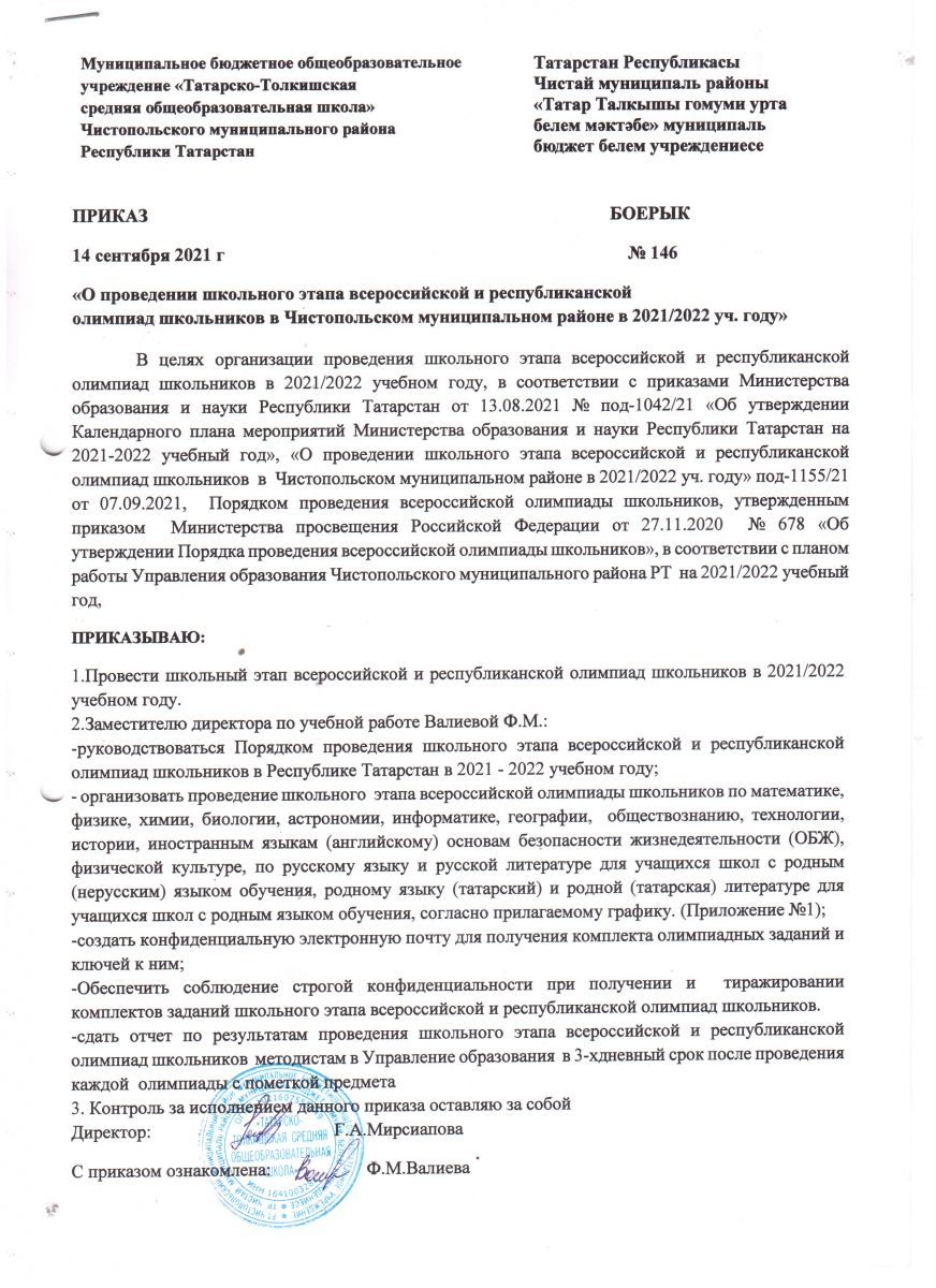 Приказ "О проведении школьного этапа олимпиады в 2021-2022 учебном году"