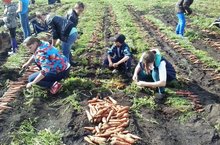Учащиеся собирают урожай моркови.
