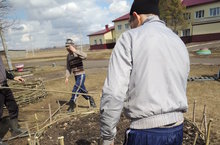 "Сделаем наш пришкольный участок чище и краше"- старшеклассники сами плели карзины для цветов.