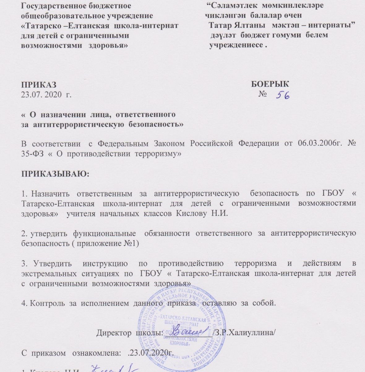 Приказ "О назначении лица, ответственного за антитеррористическую безопасность"