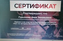 Все учителя нашей школы приняли участие в Международной Акции "Тест по истории Великой Отечественной войны" и получили Сертификаты. МОЛОДЦЫ!!!