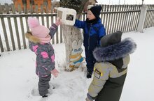 В рамках календарного планирования, дети во время дневной прогулки насыпают зерно в кормушки для птиц.