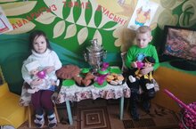 С пирогами, плюшками.Дети в свободное время любят играть в различные игры, на этот раз они устроили чаепитие для кукол.