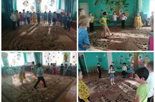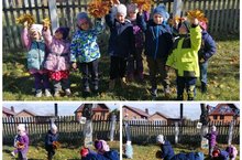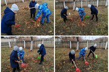 Дети во время дневной прогулки помогают убирать опавшую листву.