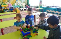 Может получиться дом.Дети разновозрастной группы строят дом конструктором "ЛЕГО"