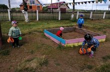 Мне для мамы с папою!Дети во время прогулки играют на песке с выносным материалом.