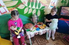 С пирогами, плюшками.Дети во время самостоятельной деятельности угощают кукол чаем.