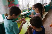 Дети разновозрастной группы в свободной деятельности наблюдали за весенними веточками (тополь, береза, липа). Отметили, какие произошли изменения, на каких веточках появились листья раньше, на каких - позже.