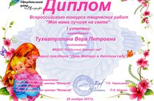 Дипломом I степени Всероссийского конкурса творческих работ "Моя мама лучшая на свете", награждается воспитатель Тухватуллина В.П. Сценарий праздника "День матери в детском саду" старше-подготовительная группа.