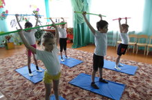 Мы на цыпочки привстали,Ручки кверху мы подняли,Мы вздохнули, потянулисьИ друг другу улыбнулись.Дети старше-подготовительной группы на физкультуре. -