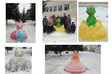 Да вот же они! Стоят около крыльца школы,ждут наступления нового года! Слепили их 9 и 10 классы.