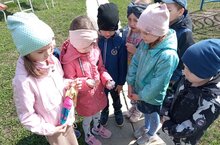 Во время прогулки на детской площадке воспитанники обнаружили маленькие яйца. Оказались, это яйца голубей, которые живут на крыше теневого навеса. Дети с воспитаелем вспомнили про жизнь голубей. Затем положили яйца на видное место, чтоб их увидели голуби.