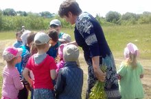 Воспитаниики вместе со взрослыми отправились на экскурсию к местному водоему. Воспитатель просит детей обратить внимание на окружающую обстановку: как и куда идет дорога, куда она поворачивает, что расположено вдоль дороги. Привлекает внимание дошкольников к красоте летней природы. Дети остановились за несколько метров до водоема, полюбовались им издали. Возле воды приятно отдыхать - свежий воздух, легко дышится, глазам приятно смотрть на зелень и воду. Затем воспитатель показывает на знак возле водоема "Купаться запрещено!". Дети всомнили все правила и телефон службы спасения.