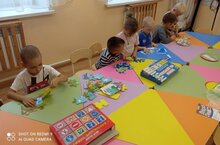 Воспитанники старшей группы собирют в паззлы знаки дорожного движения.