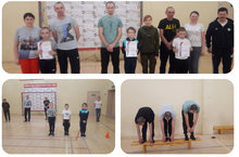 Программа соревнований включала следующие виды испытаний: поднимание туловища из положения лежа на спине, наклон из положения стоя на гимнастической скамье – отцы; бег на 30м, прыжок с длину с места толчком двумя ногами (см)- матери; сгибание и разгибание рук в упоре лежа, прыжки через препятствия –дети.