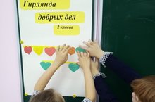 Акция «Гирлянда добрых дел», где каждый из учеников прикреплял в ввиде гирлянды сообщение о том, какое доброе дело совершил. Эти записи велись на специальных разноцветных заранее приготовленных сердечках .