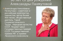 Сегодня исполняется 90 лет великому композитору СССР и России А.Н. Пахмутовой. В школе сегодня классный час был посвящен ей. На мероприятии дети познакомились с творчеством композитора, все вместе исполнили всемлюбимую песню "Надежда".