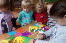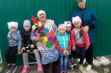 В нашей разновозрастной группе имеется девочка-инвалид (нарушение интеллекта) Валиуллина Лиана.Она невыговаривает слова,леворукая,плохо с мторикой рук.Наши дети никогда не оставляют её в беде.,всегда помогают.Сегодня из своих отпечаток рук сделали большой букет для Лианы и для пожилых инвалидов, ветеранов нашего села. И написали с разноцветными буквами "Добро твори,тепло дари!"