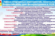 Афиша спортивных мероприятий, посвященных Всероссийскому дню физкультурника в 2024 году. В рамках Дня физкультурника запланирован фестиваль ГТО среди организаций и поселений района.