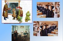 В старину детей учили навыкам ведения домашнего хозяйства, крестьянского и ремесленного труда. Читать и писать на Руси стали учить около 1000 лет назад. Книги в то время печатать ещё не умели. Их писали на выделанной тонкой коже животных- пергаменте. Листы пергамента сшивали в книги с деревянными обложками и металлическими застёжками. Каждая книга писалась около нескольких месяцев и ценилась на вес золота. На руси ученики писали на сырых глиняных плитках, на деревянных дощечках, покрытых слоем воска, на бересте. Когда изобрели бумагу и чернила стали писать гусиными перьями, которые обмакивали в чернильницу. Написанное посыпали мелким песком, чтобы чернила быстрее высыхли. Ученики сидели на лавках вдоль длинного стола. За плохое прилежание в учёбе и плохое поведени ученика могли наказать: поставить на колени в угол на сушёный горох. Позже перо было заменено на деревянную ручку со стальным пером. В школу носили чернильницы. Для них в партах делали специальные отверстия. Позже появились современные шариковые ручки. Начальная сельская школа располагалась в обычной избе. Девочки носили одинаковые тёмные платья и фартуки. В праздничные дни надевали вместо тёмных фартуков и лент нарядные белые. -