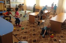 Бүген бик иркенләп булган барлык уенчыкларны алып уйнадык. Билгеле инде алар барысыда идәндә. Менә хәзер шуларны җыештырабыз. Тәрәз төпләрен дә чистартып тәртиплибез.