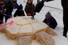 Фигурки из снега мы лепим не только, когда снег липкий, а в любое время. Чтобы снег стал податливым, мы используем холодную воду. В ведре делается снежное «тесто», по мере необходимости в ведро добавляется или вода, или снег. Приступая к работе надо очень хорошо представлять, то, что ты хочешь слепить. Мы задумали черепаху. Сначала снег собрали в кучу, и ему предали очертание будущей постройки. Затем вылепливали крупные детали тела черепахи, потом разбавили в воде коричневый коллер и полили на фигуру. Целью таких построек является развитие у детей ловкости, глазомера, мелкой моторики руки, знания основных цветов.